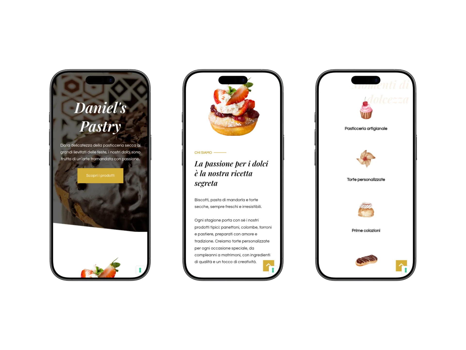 Sito vetrina per una pasticceria artigianale specializzata in torte personalizzate. Design pulito e visivo, struttura per categorie prodotto e sviluppo WordPress con gestione semplice di contenuti stagionali e richieste su misura.